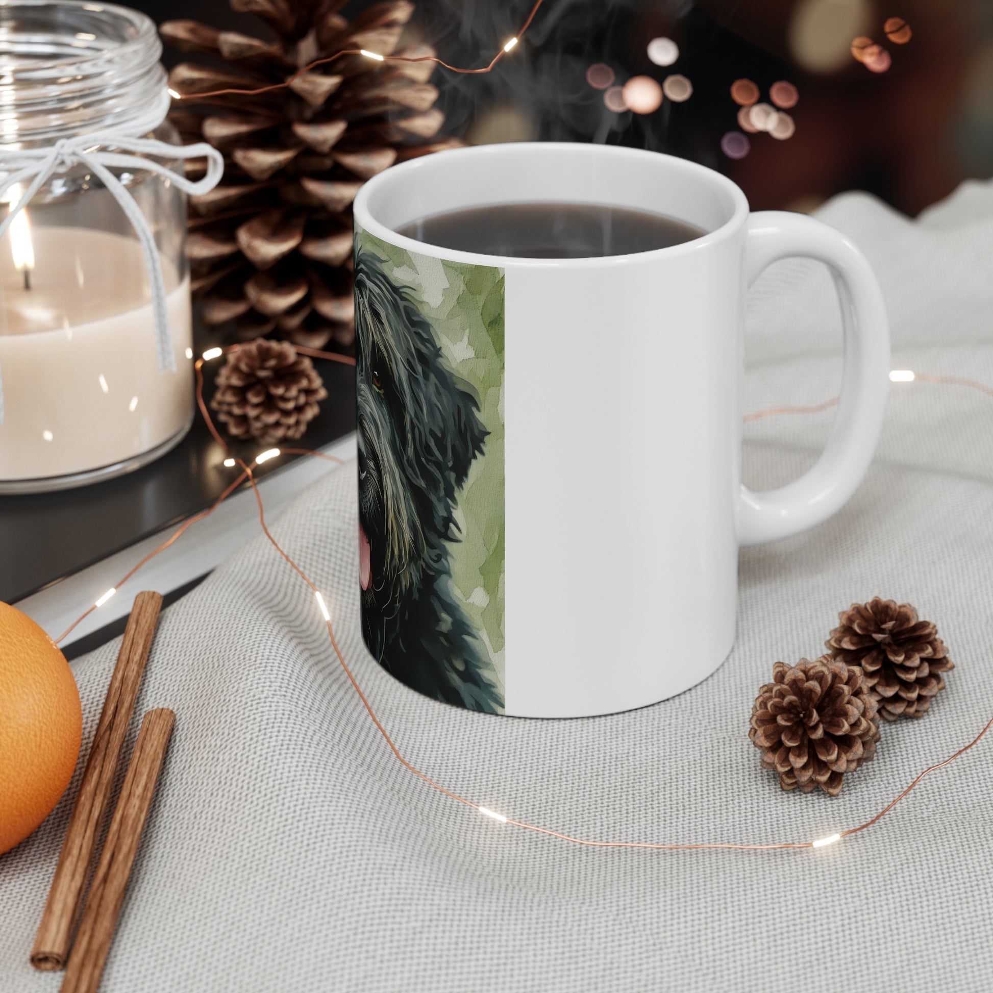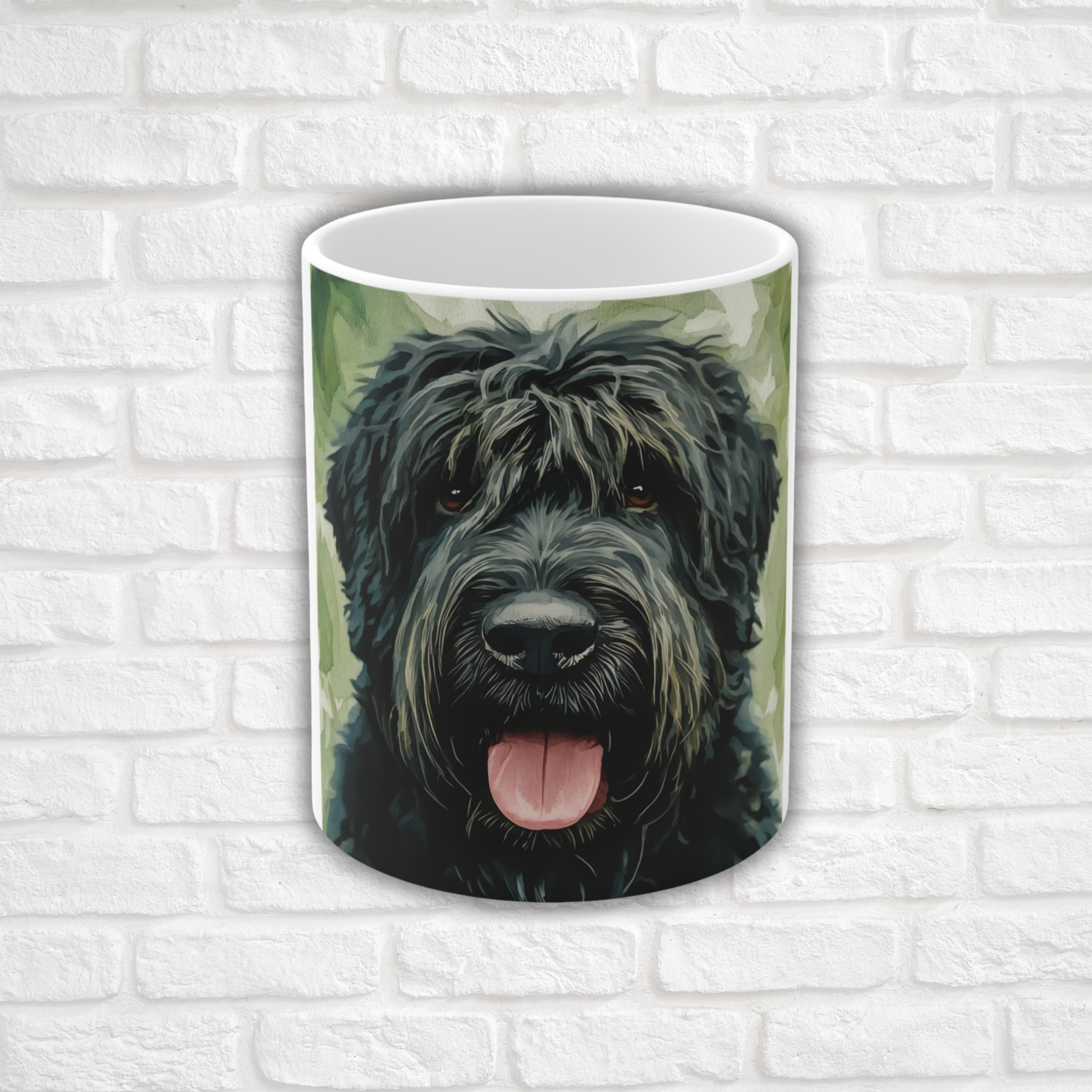 Start your mornings with the commanding presence of the Black Russian Terrier. This 11 oz white ceramic coffee mug showcases a striking headshot of the breed, making it a favorite for terrier lovers.