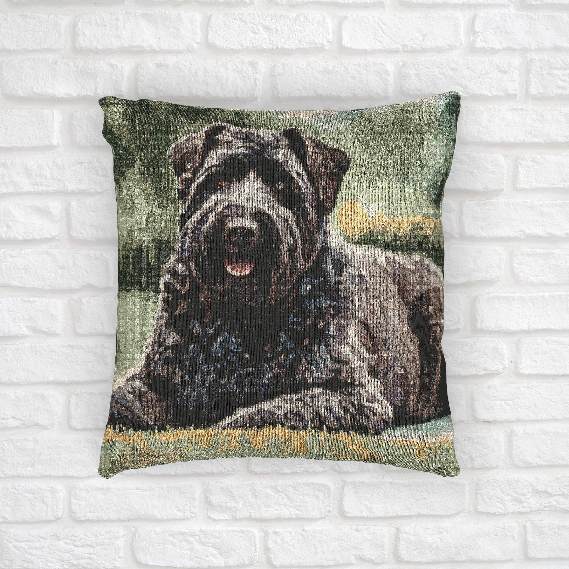 Bring the loyalty and strength of the Bouvier des Flandres into your home with this decorative throw pillow. Measuring 17" x 18", this woven pillow is crafted from a durable blend of 58% cotton and 42% polyester, offering both comfort and lasting beauty.