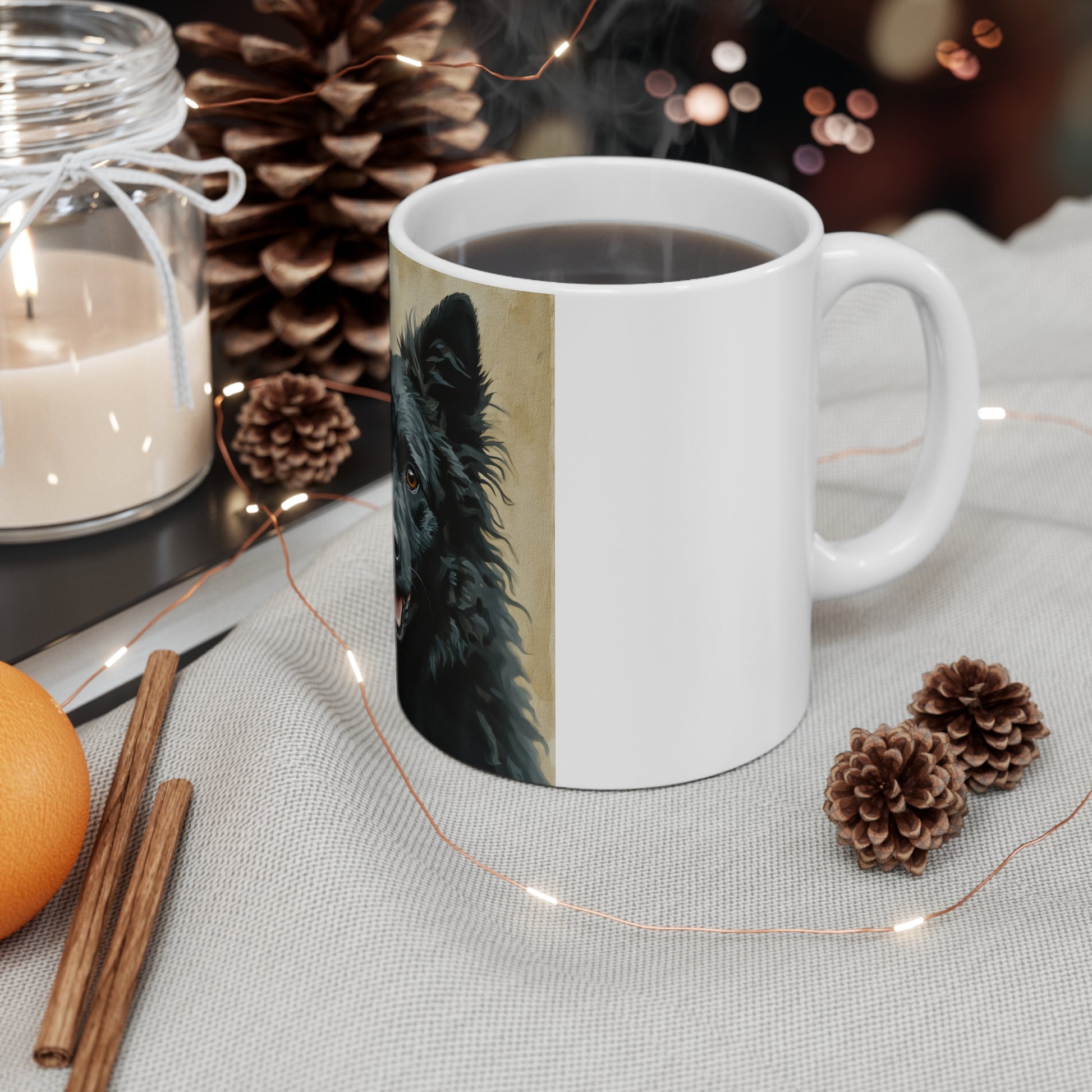 Start your morning with the loyal charm of the Croatian Sheepdog. This 11 oz white ceramic mug showcases a beautifully detailed watercolor headshot of this rare and intelligent herding breed.