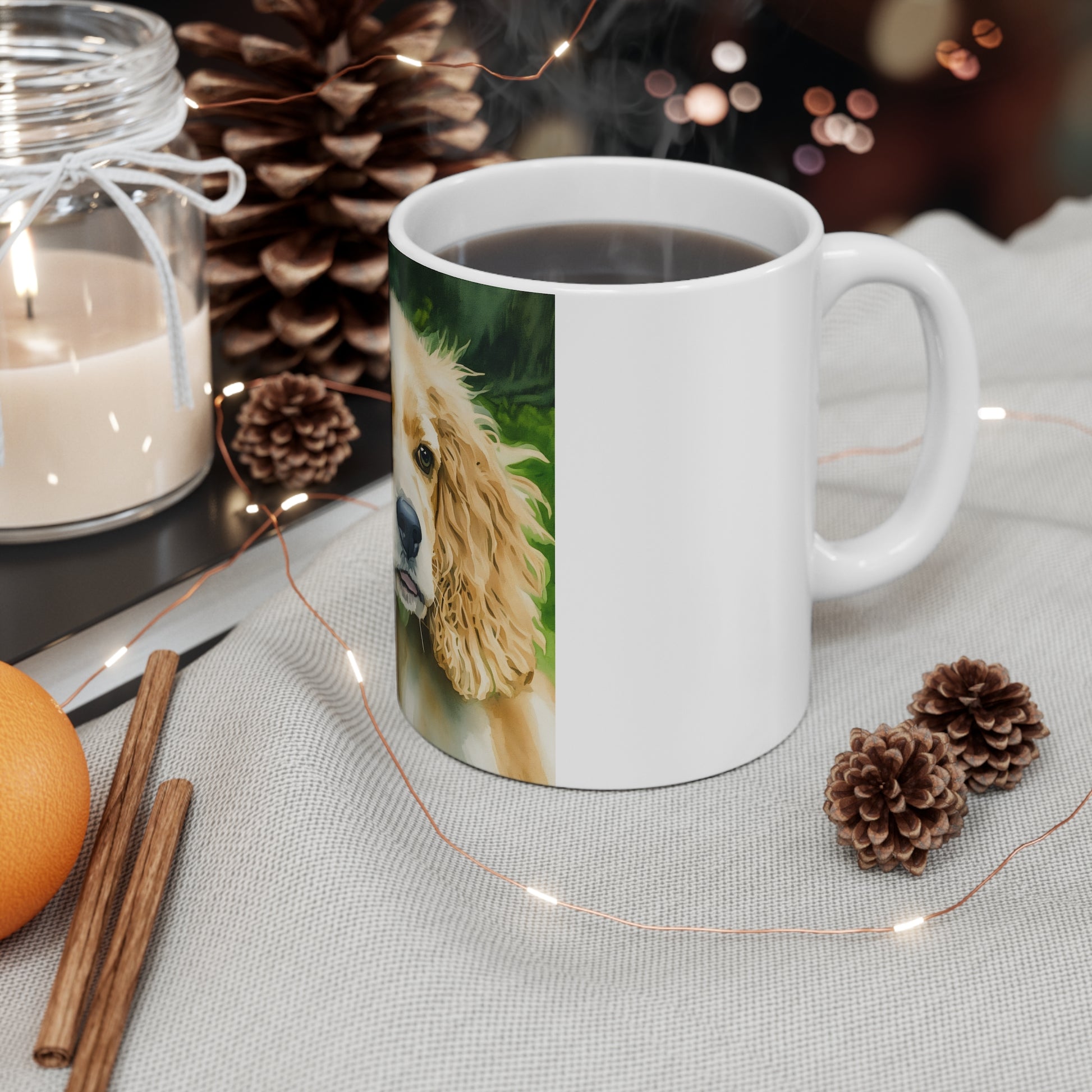 Brighten your coffee break with the soulful eyes and silky ears of the English Cocker Spaniel. This sturdy ceramic mug displays a high-resolution watercolor headshot that captures the breed’s affectionate personality.