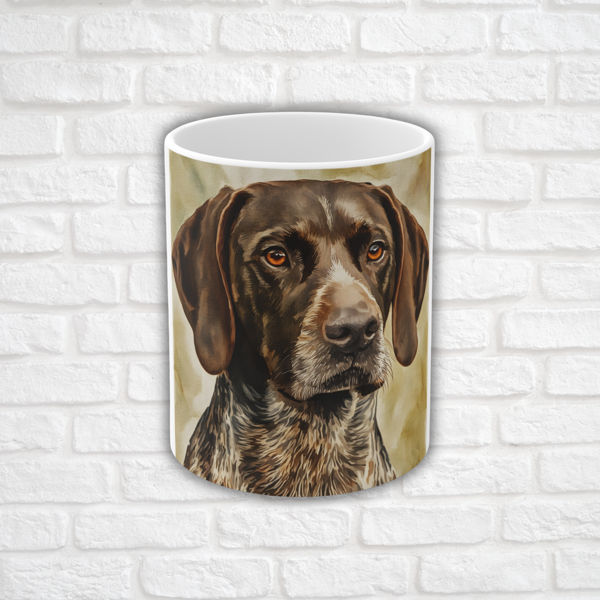 This premium ceramic coffee mug features a stunning watercolor portrait of the energetic German Shorthaired Pointer.
