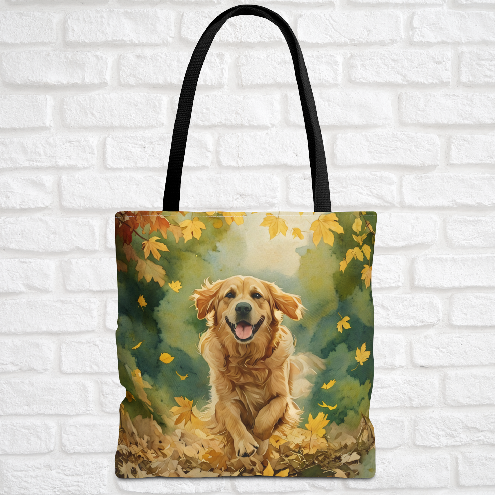 Jump into joy with this heartwarming Golden Retriever tote bag, featuring a playful watercolor design of your favorite fluffy friend bounding through a forest of golden leaves. With rich autumn tones and a radiant smile, this bag celebrates the boundless energy and golden heart that make this breed one of the most beloved in the world.