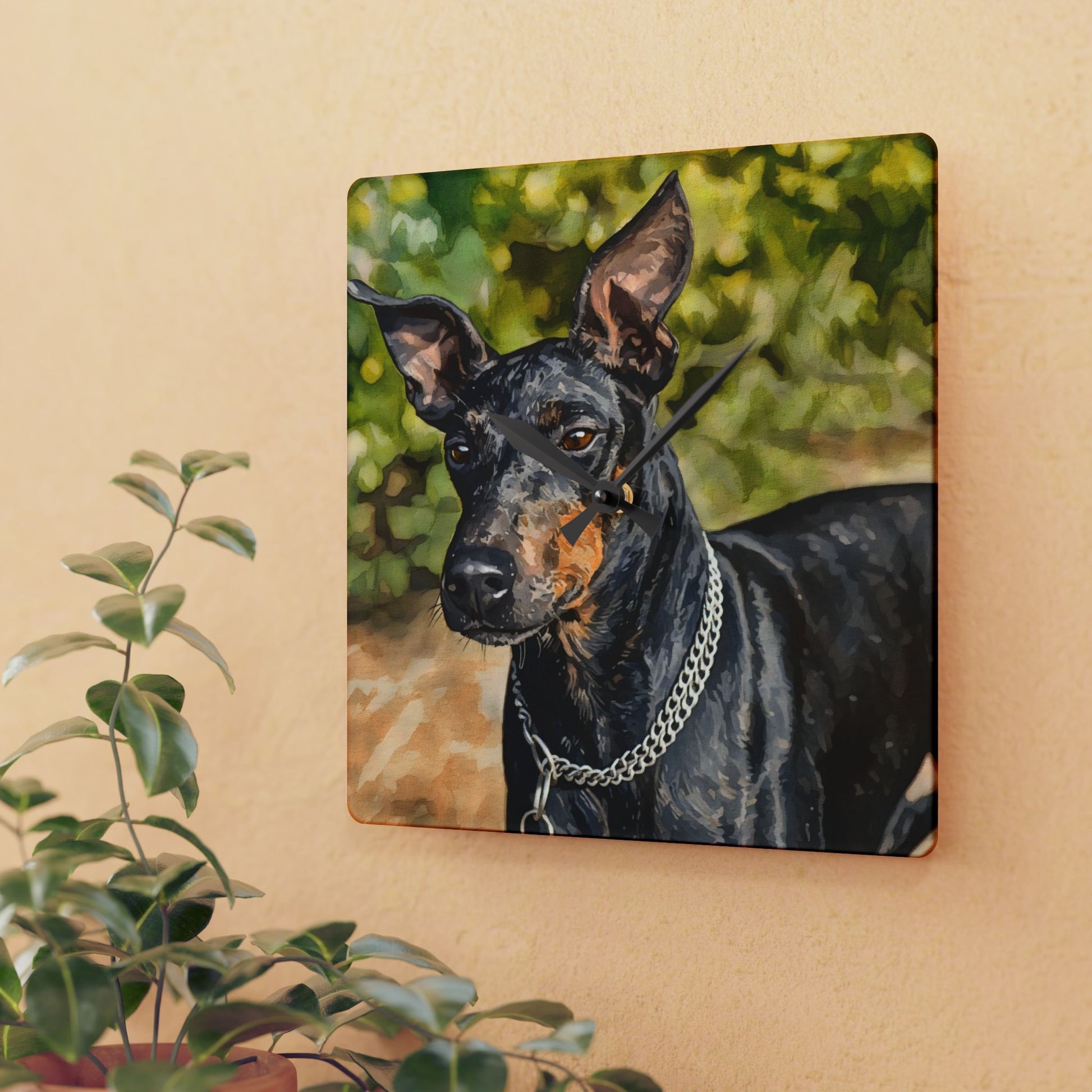 Add a touch of character to your wall with this artistic Manchester Terrier clock. The sleek acrylic surface brings out the breed’s sharp black-and-tan contrast in vibrant watercolor tones.