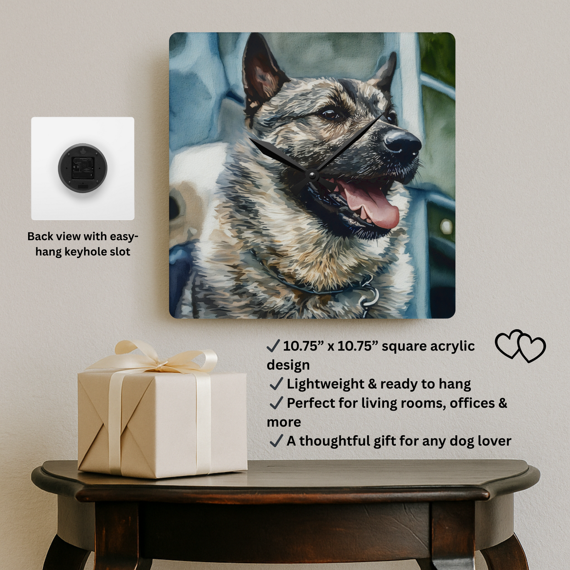 Bring the noble presence of the Norwegian Elkhound to your home décor. This elegant acrylic wall clock displays a stunning watercolor design highlighting the breed’s thick coat and confident expression.