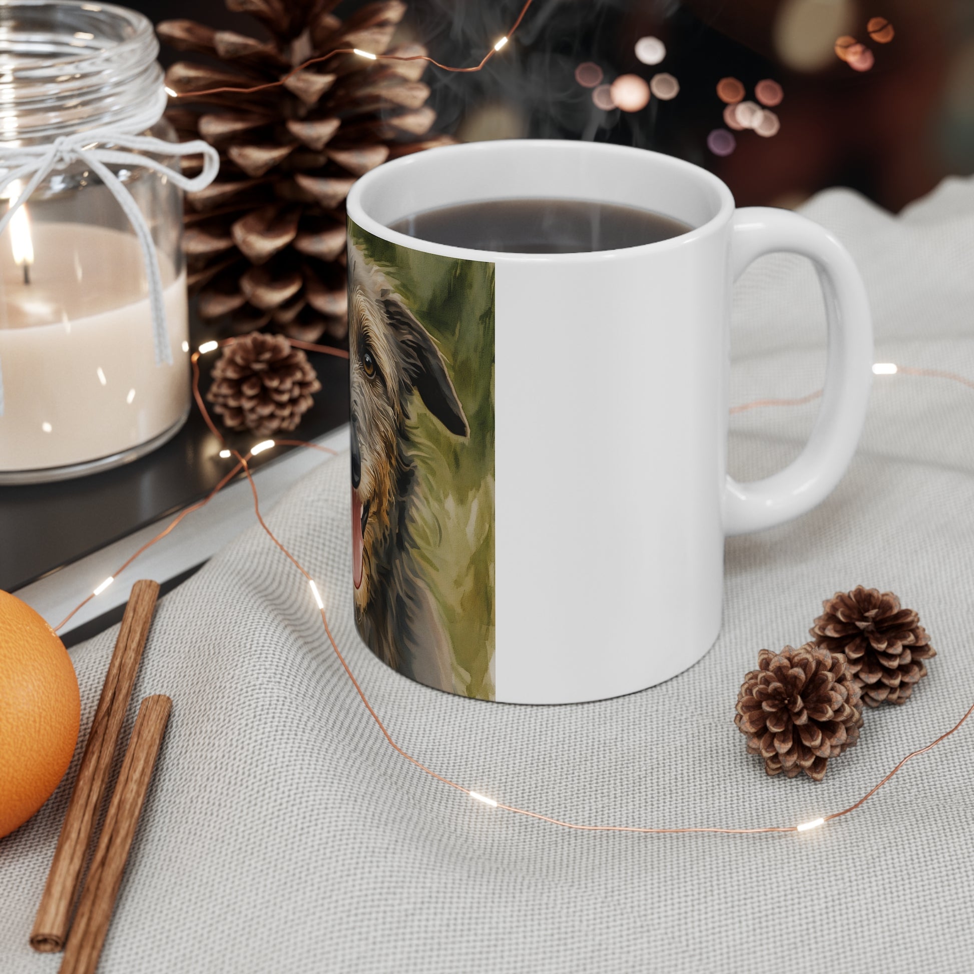 Sip in style with the grace of the Scottish Deerhound. This 11 oz ceramic mug showcases a detailed watercolor of this noble sighthound, capturing its wiry coat and dignified stance.