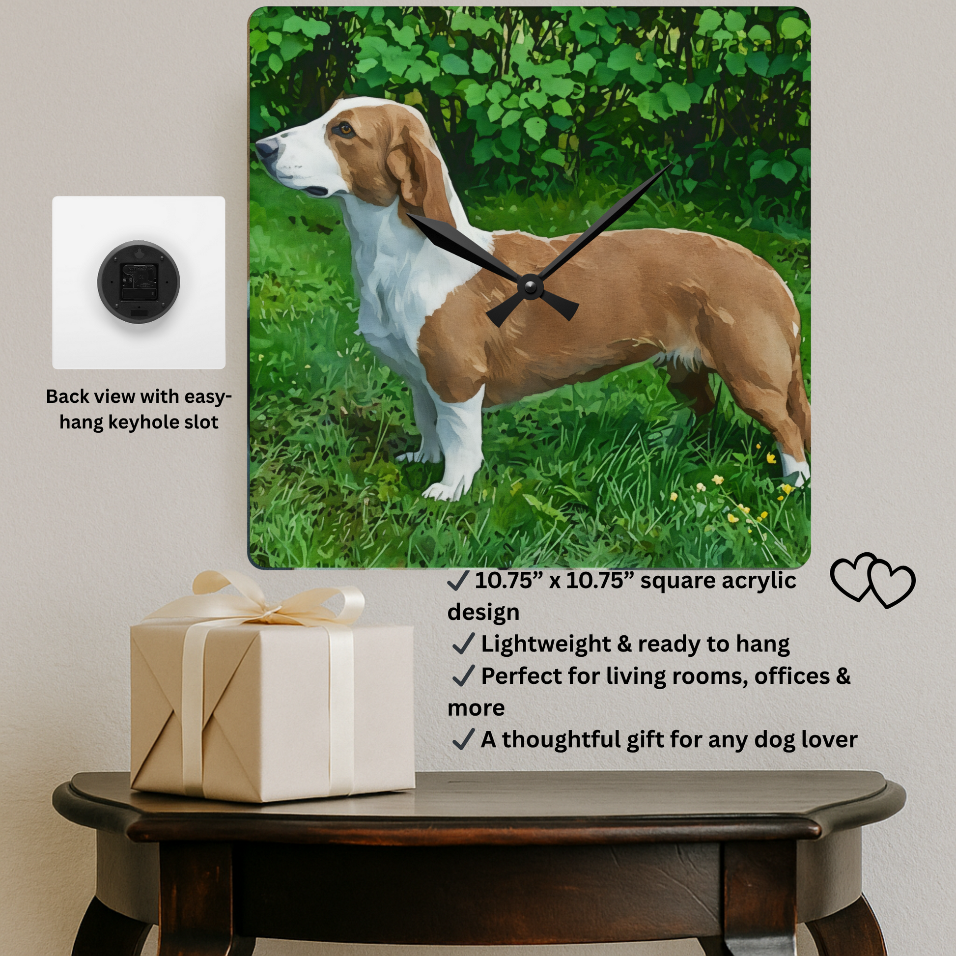 Showcase the friendly Drever, Sweden’s beloved scent hound, with this modern acrylic wall clock. Featuring a vibrant watercolor portrait, the 10.75" square clock includes silent sweep hands and a keyhole for easy hanging.